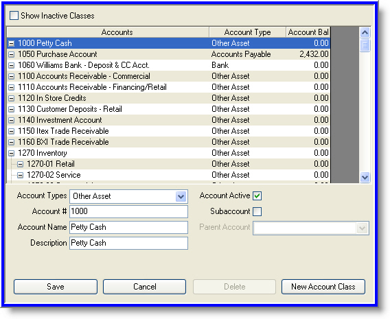 The chart of accounts capabilities within the tool are broken into accounts and classes. While accounts describe the transaction, classes group the transaction based on the location or business entity, such as a store or warehouse location. Both accounts and classes support up to five levels of substructure.