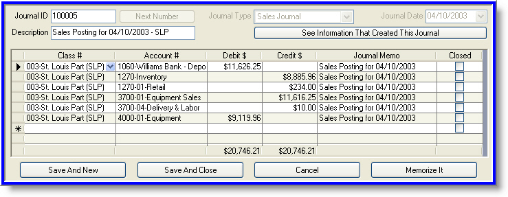 Manual journals may be made to the general ledger at any time. Journals may be memorized within the system and reused. Additionally, a journal may be defined such that it will be automatically reversed at the start of the next accounting period.