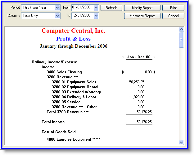 General ledger reporting capabilities within the tool generate two primary types of reports: Profit/Loss Statements and Balance Sheets. Each type of report allows comparisons to a previous period, previous year (same period), year-to-date, and previous year (same year-to-date). Other options within both reports allow comparison of individual account values based on percent of row, percent of column, percent of income, percent of expense, dollars change, percent of change, and percent of year-to-date, where appropriate. Once a report has been customized, the configuration can be saved and applied to future report generation.