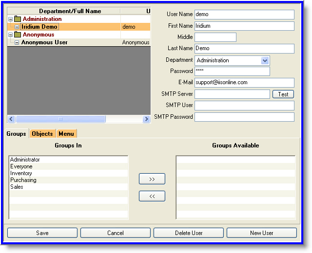 The IRIDIUM Retail Management Software tool is configured according to group job functionality, as well as the needs of individual users. Default user groups include administrator, everyone, inventory, purchasing, and sales. Custom user groups may be created based on the needs of individual retail locations and distribution centers.