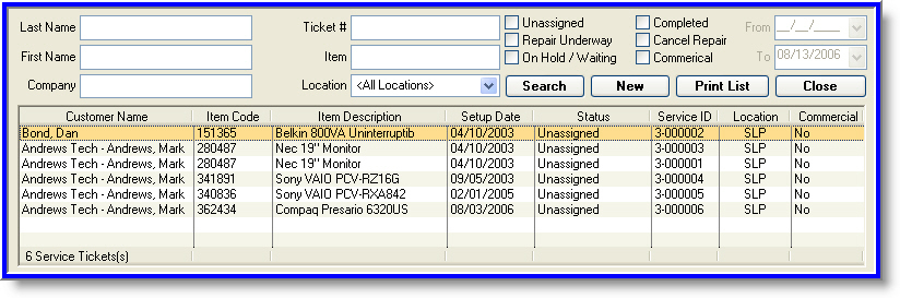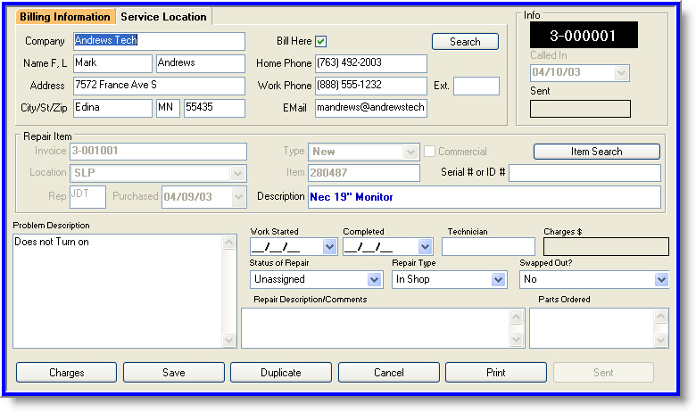 Same or different billing and service location information may be specified on the ticket, depending on the nature of the service request. If a repair item was on a previously generated invoice, detailed information such as invoice number, sale location, sales representative, item type, item number, and text description is automatically added to the service ticket. Text fields for entering specific details on the nature of the problem are added to the screen on the creation date.