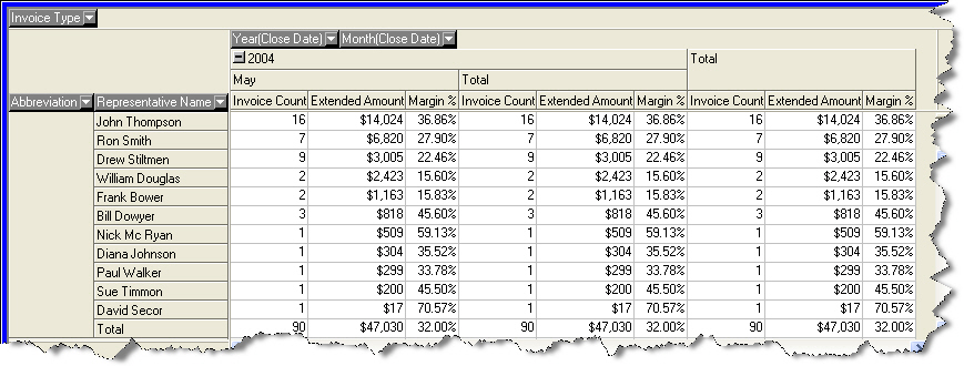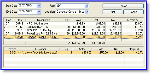 By drilling down into productivity inquiry data, the tool provides a detailed list of items sold by individual sales representatives. Given the inventory item, a complete list of customer contact information and additional items on the sales invoice is also available.