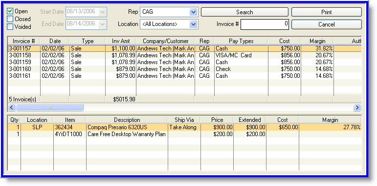 Productivity of any, or all, retail locations can be determined through sales volume numbers listed in the invoice inquiry screen (linking the Productivity Tracking System with the Invoicing System).