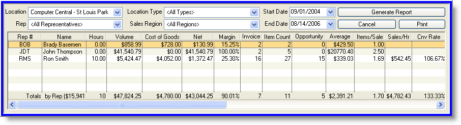 Sales representative reports may be generated and printed. These items may also be exported to Adobe PDF or Microsoft Excel formats for electronic formatting and distribution.