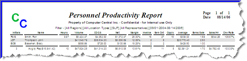 Additionally, invoice counts, item counts, average sale, and items/ sale are calculated for review and analysis. If the sales representative uses the time clock, sales per hour and prospects/ opportunities are provided along with sales conversion rates.
