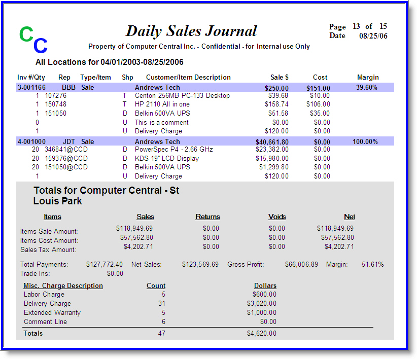 Daily sales journals may be generated to view the total sales values by location and associated sales representatives. Net sales, gross profits, and profit margins are displayed, as well as individual details for each line item including sales tax and items sale and cost of goods sold.