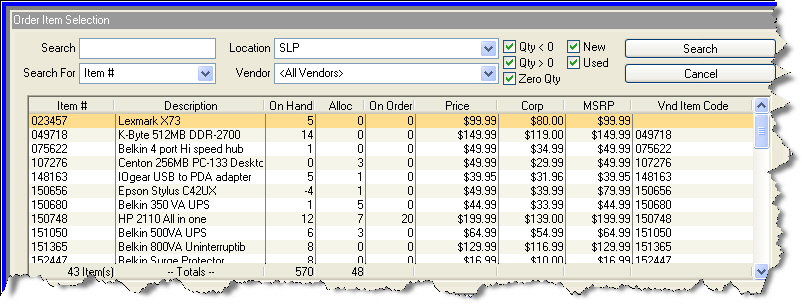 Items already in the Inventory Management System may be added to a quote, sales order, or invoice by simply entering the item number/SKU, scanning the barcode or UPC symbol, or by searching for the item number, description, or vendor’s item number. The system also displays the item quantity, its location, a text description, the type of item (regular, labor, delivery, etc), allocation numbers, delivery status, shipping information, and the requested delivery date.