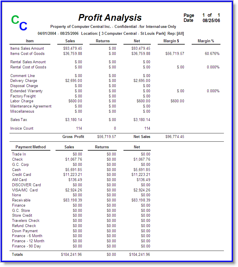 Profit analysis reports may be generated by location, for any given period of time. Profit margins and profit percentages for each item type are generated based on sales and returns. Gross sales and net sales values are also displayed, as well as itemized payment values.