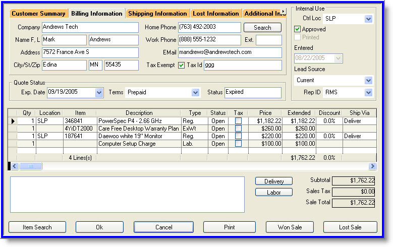Quote inquires can be conducted for a specific location, or across all locations. Search criteria include: specific quote numbers, open or closed status, approved or unapproved status, and won or lost criteria. Profit margin percentages and additional notes are also displayed when a quote identification search is conducted.