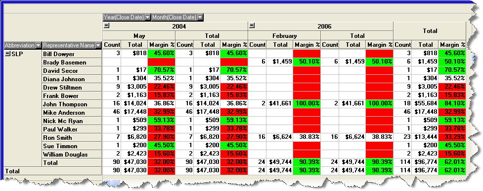 The sales analysis functionality of the tool provides detailed sales information for a given sales date, or date range, based on the sales representative, store location, item type, and vendor. This information may be customized, sorted, and rearranged on the screen to present financial data in the most effective way (including total volume, cost, net cost, and profit margin). The display also helps purchasing departments make educated decisions about re-order quantities, and links the Customer and Sales Tracking
